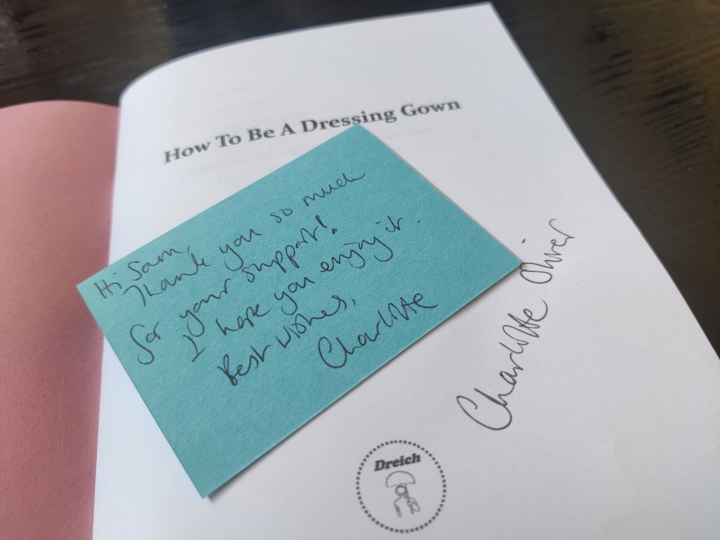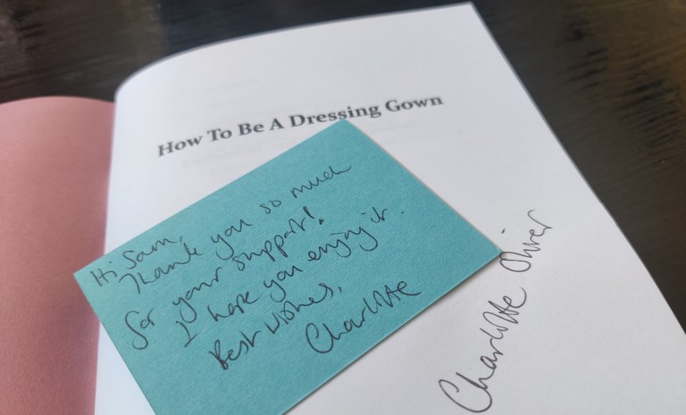 I should say that, in my own work, I write in rhyming verse, perhaps as a result of that early exposure at school to First World War poetry (which someone once suggested I may have absorbed by osmosis!). Whatever the reason, this seems to be my current tendency as a writer, so I found reading ‘How To Be A Dressing Gown’ doubly fascinating because it gave me an introduction to imagistic poetry and the way that writers can use words to conjure beautiful images in the mind. I would even go a step further and suggest that Charlotte’s work succeeds in transcending this by articulating other senses; I could almost smell those Yorkshire Puddings in her poem of the same name, and taste the comfort of a sponge pudding and many other foods that she refers to throughout the book!