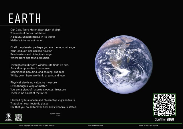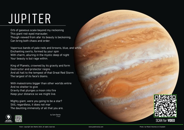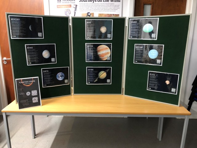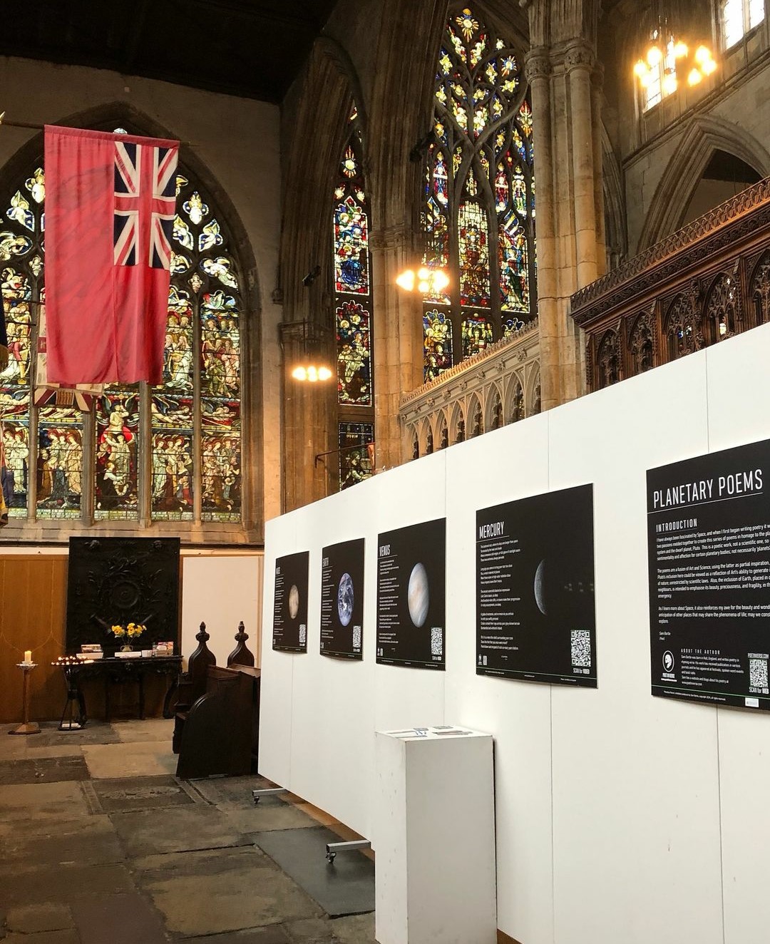 The exhibition comprises ten A0 size foam boards, including an Introduction, and a separate panel for each poem, and associated planet image i.e. Mercury, Venus, Earth, Mars, Jupiter, Saturn, Uranus, Neptune, and the nostalgic addition of Pluto (de-classified as a planet in 2006). Each panel also contains a QR code linking to my audiovisual rendition of each planetary poem.